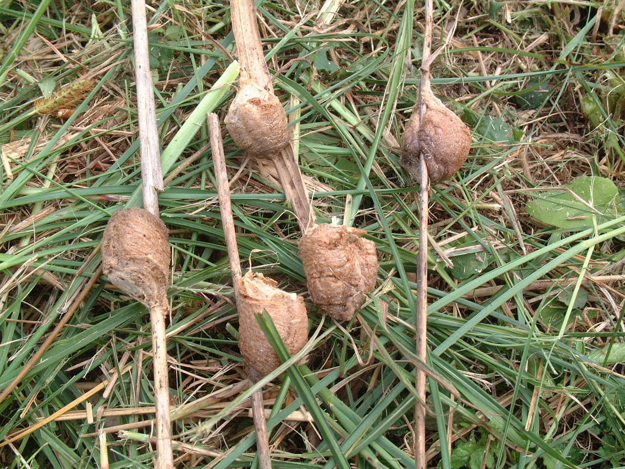 畑を拡張すべく開墾中ですが、ススキの株の中にカマキリの卵を発見しました。