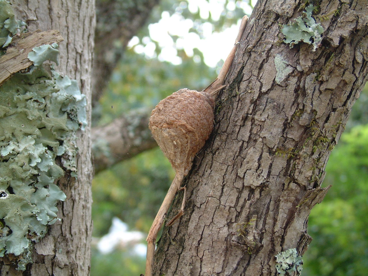 卵塊はホッチキスで隣接する柿の木に止めておきます。