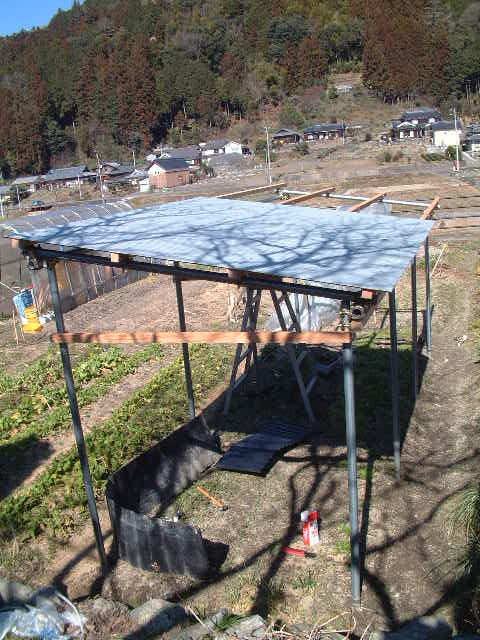 ご覧の通り単管パイプと垂木で作った基本構造にトタン板張っただけなんですがねぇ。