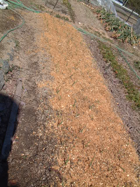 霜柱で押し出されたタマネギ苗を埋め戻し、廃菌床を振りました。