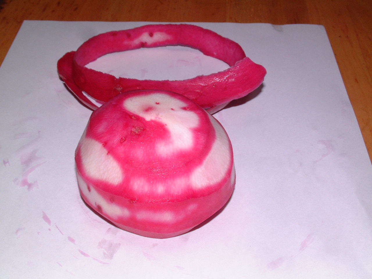 赤い皮を残すと鮮やかに仕上がりますが、皮が硬いので調整して下さい。